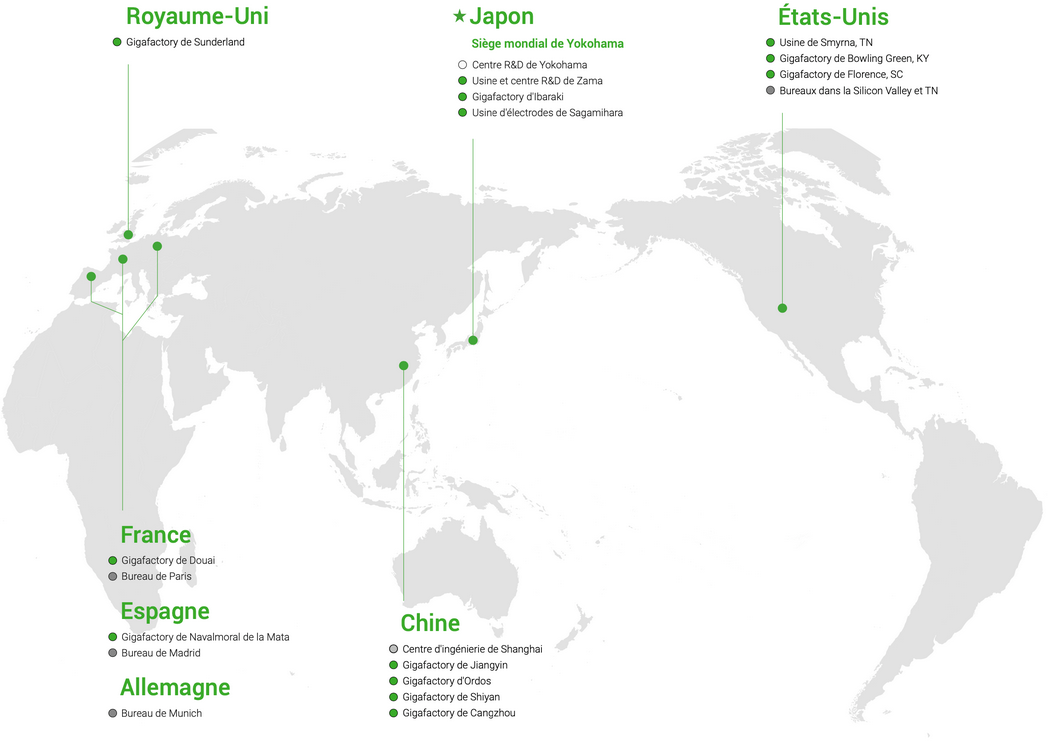 Fondée au Japon en 2007 et basée à Yokohama, AESC a développé des capacités de fabrication à travers le monde aux États-Unis, au Royaume-Uni, en Europe, au Japon et en Chine pour servir les marchés clés et les principaux clients locaux depuis plus de 14 ans.