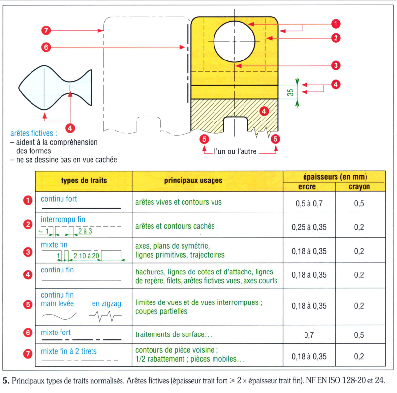 Le dessin industriel utilise de nombreux traits différents. Chaque trait a sa nature (continu, interrompu, mixte), une épaisseur (fort, fin) et est destiné à un usage donné ; exemple, cas de la norme NF EN ISO 128-20, figure 5. Les dispositifs CAO/DAO en propose une grande variété. Largeurs recommandées (ISO): 0,13 ; 0,18; 0,25; 0,35 ; 0,5 ; 0,7 ; 1 ; 1,4 ; 2.