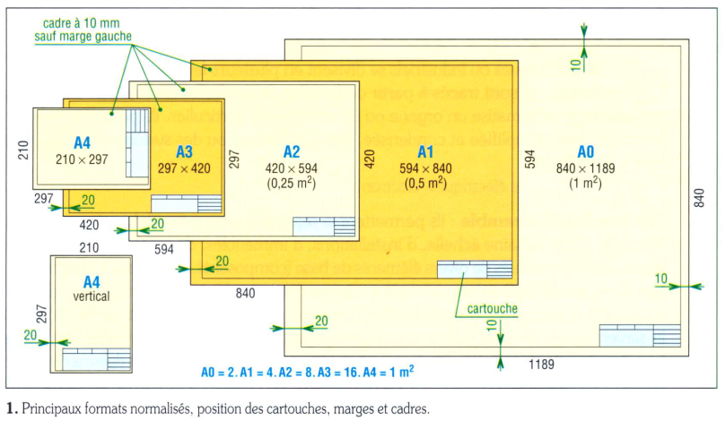 La série A (A0, Al , A2, A3, A4), normalisée ISO, est universellement utilisée. Les formats A3 à A0 doivent être utilisés horizontalement et le format A4 verticalement (ISO 5457), cartouche en bas à droite, marge gauche à 20 mm, autres marges à 10 mm. Le format A4 (210 x 297 mm) correspond à la taille d'une feuille de papier standard type courrier. Le format A3 (420 x 297) se déduit du A4 en multipliant la plus petite dimension par deux (210 x 2 = 420) . De même le A2 (594 x 420) s'obtient en multipliant la plus petite dimension du A3 par 2 (297 x 2 = 594) et ainsi de suite pour les autres formats. Pour chaque format le rapport longueur sur largeur est égal à J2 ("' 1.414) .