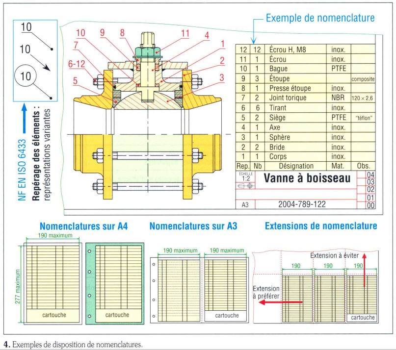 Remarques : la CAO/DAO offre des possibilités de nomenclaturage automatique avec présentation personnalisée. L'ISO 7573 propose une variante avec repère ; nombre ; référence pièce; nom pièce ; désignation pièce ; observations - 6 colonnes.