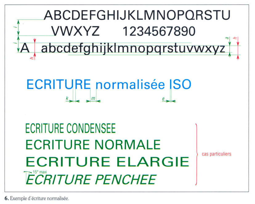 - Il faut préférer une écriture droite à une écriture penchée. La norme tolère une écriture penchée de 15° maximum vers la droite. En dessin manuel, les écritures sont le plus souvent réalisées avec des trace-lettres ; les systèmes par lettres transferts sont également utilisés.