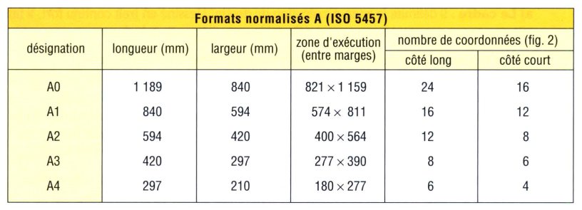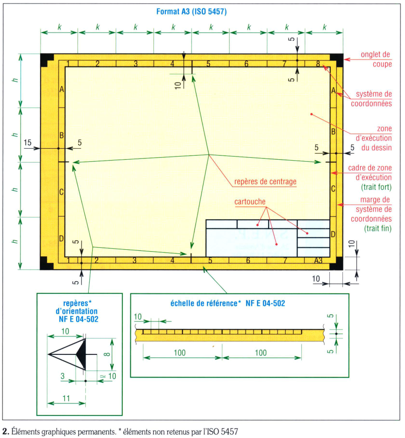 a) Le cadre :il délimite la zone d'exécution du dessin. Dessiné en trait continu fort , il fait apparaître une marge sur tout le contour et délimite la zone d’exécution du dessin . b) Les repères :ils sont situés dans la marge entre le cadre et le bord du dessin. - Les repères de centrage : au nombre de quatre, ils indiquent les axes de symétrie du format et sont généralement matérialisés par un trait continu fort (forme libre de choix). - Les repères d'orientation : au nombre de deux sur les supports pré-imprimés, ils se superposent aux repères de centrage. Une fois le dessin terminé il ne doit rester qu'un seul repère, celui orienté vers le dessinateur ou le lecteur. Ils ne sont pas retenus par l'ISO 545 7. c) Le système de coordonnées :à partir de lettres (A,B,C. .. ), de haut en bas, et de chiffres (1,2,3 ... ), de gauche à droite, il permet de localiser les différentes parties de la zone dessinée. Le nombre de coordonnées, fonction du format, divisible par 2, est indiqué page 7. Hauteur des caractères : 3,5 mm. d) La graduation centimétrique de référence :non chiffrée (longueur minimale 200 mm, largeur maximale 5 mm), elle peut figurer dans la marge près du cadre (non retenue par ISO 545 7) . e) Les onglets de coupe : placés aux quatre coins du dessin, ils facilitent la découpe des reproductions au format voulu et sont matérialisés par deux rectangles 10 x 5 se chevauchant.