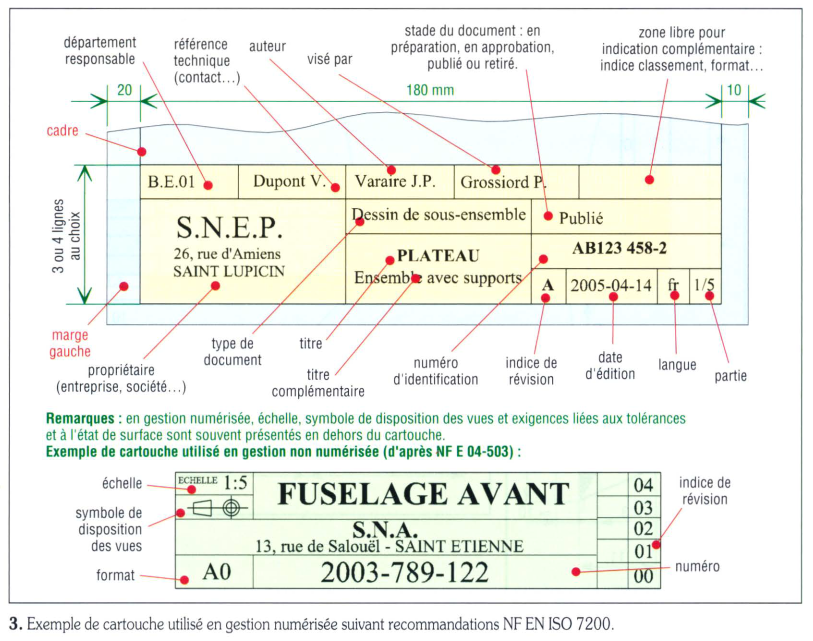 Le cartouche est la carte d'identité du dessin ou document. Son emplacement dans le format est indiqué figure 1 ; le sens de lecture du dessin est celui du cartouche. Plus complet en gestion numérisée, il rassemble les renseignements essentiels : données d'identification (propriétaire, numéro d'identification, indice de révision, date d'édition, numéro partie, langue ... ), titre et données administratives (auteur, département, référence technique, visé par; type, stade et format du document. ..).