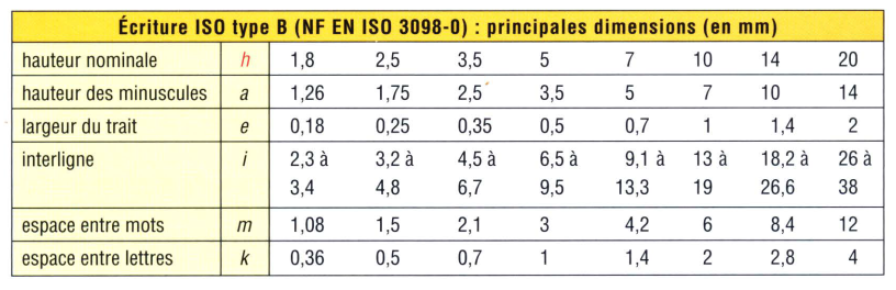 - On doit utiliser en priorité des écritures normalisées. La norme NF EN ISO 3098-0 retient les types A et B de la norme ISO (l 'ancienne norme NF E 04-505 ne retenait que le type B et pas h = 1,8). Les types A et B ont même hauteur h. A est plus fin que le B.