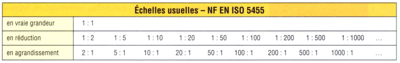 Lorsque les objets sont grands (immeubles, bateaux, automobiles) ou petits (montres, circuits électroniques, par exemple) il est nécessaire de faire des réductions ou des agrandissements pour les représenter. L'échelle 1 (ou 1 : 1) présente l'avantage de visualiser l'objet à définir en vraie grandeur, sans réduction et sans agrandissement. Les échelles 1 : 2 et 2 : 1 peuvent apporter des impressions trompeuses en conception.