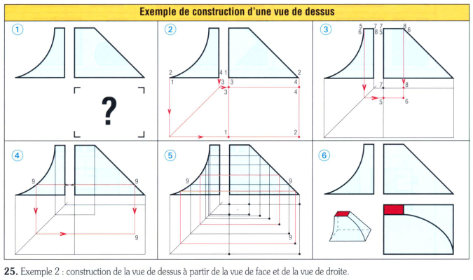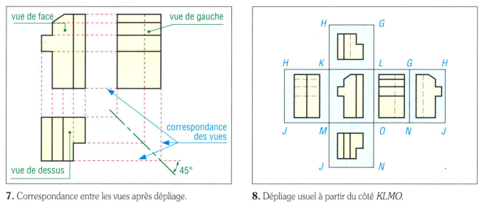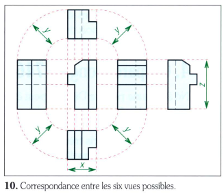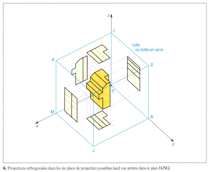 définir cinq autres vues ou projections orthogonales (analogie avec les six faces d'un dé ou d'un