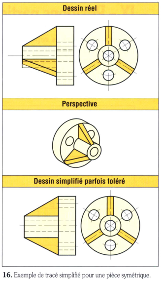 Cas particulier (parfois toléré) : pour certains objets symétriques présentant des nervures et des trous en nombre impair, un tracé simplifié peut parfois être toléré. Les formes les plus délicates à dessiner peuvent être ramenées dans le plan de symétrie de l'objet afin de simplifier les tracés de l'une des vues (fig. 16).
