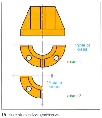 Une demi-vue, parfois un quart de vue, remplace avantageusement une vue complète lorsque les objets sont symétriques (fig. 15). Règle normalisée : la demi-vue doit être limitée par un trait d'axe et la symétrie symbolisée par deux paires de petits traits fin parallèles tracés perpendiculairement aux extrémités de ce trait d'axe.