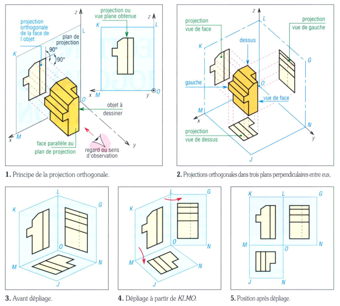 L'observateur se place perpendiculairement à l'une des faces de l'objet à définir. La face observée est ensuite projetée et dessinée dans un plan de projection parallèle à cette face et situé en arrière de l'objet. La vue, plane, dessinée obtenue est une projection orthogonale de l'objet.