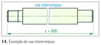 Ce sont des vues partielles particulières utilisées lorsque les objets sont très longs. Seules les parties essentielles sont dessinées et une cote indique la longueur. Deux traits fins ou zigzag limitent les parties raccourcies. |