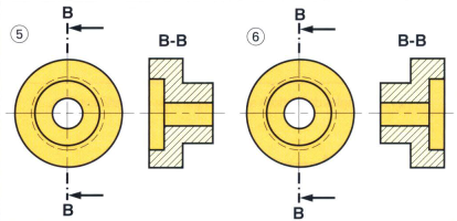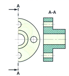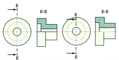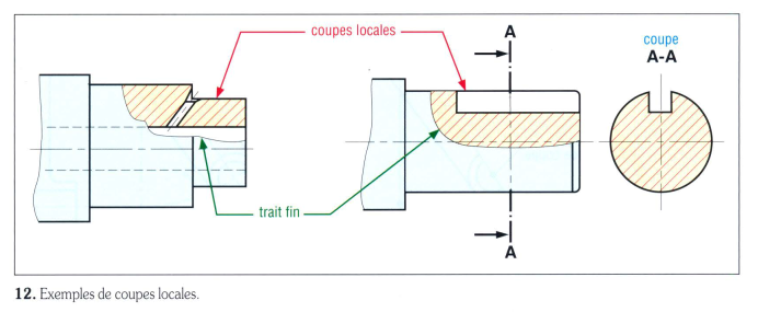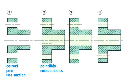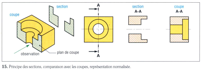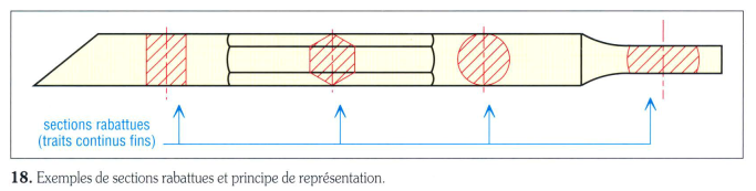 On peut les considérer comme des vues complémentaires ou auxiliaires. Elles se présentent comme une variante simplifiée des vues en coupe et permettent de définir avec exactitude une forme, un contour, un profil en éliminant un grand nombre de tracés inutiles. Les sections sont définies de la même manière que les coupes: plan de coupe, flèches , etc.