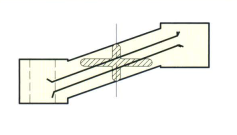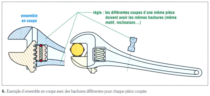 b) Des pièces ou des objets différents appartenant à un même ensemble en coupe doivent avoir des hachures différentes : inclinaisons différentes et au besoin motifs différents.