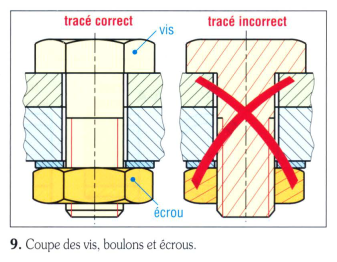 c) On ne coupe jamais les pièces de révolution pleines (cylindriques ou sphériques telles que axes, arbres, billes .. .), les vis, boulons, écrous, rivets, clavettes.