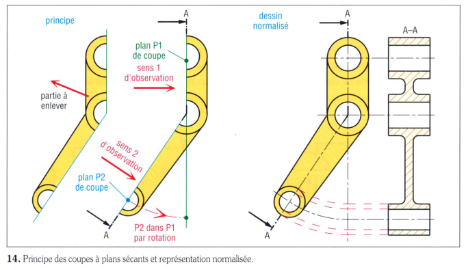 Le plan de coupe est constitué de deux plans sécants. La vue coupée est obtenue en ramenant dans un même plan les tronçons coupés par les plans de coupe successifs ; les parties coupées s'additionnent. Dans ce cas la correspondance entre les vues n'est que partiellement conservée.
