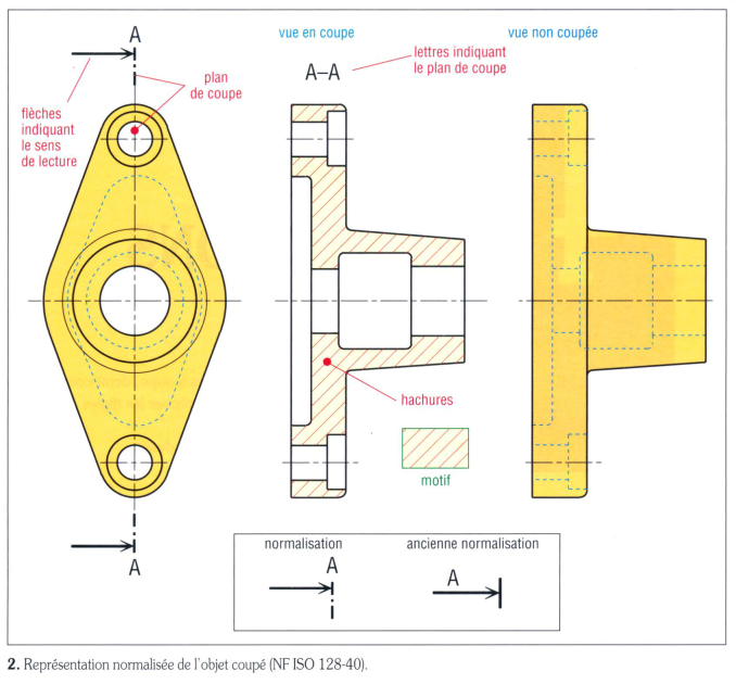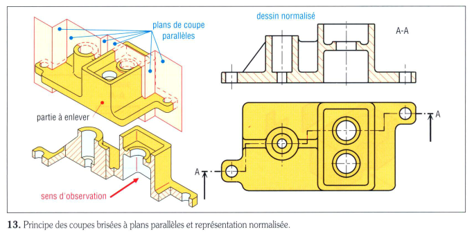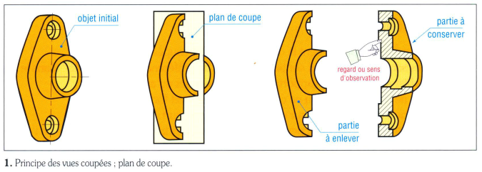Les principes de représentation étudiés dans le chapitre précédent sont parfaitement adaptés à la description et à la définition des formes et contours extérieurs, même pour les objets complexes. Dans le cas de pièces creuses il n'en est pas de même, les formes intérieures décrites à partir de traits interrompus courts sont difficiles à définir. Pour améliorer la définition et la lecture on dispose des vues en coupe (coupes et sections).