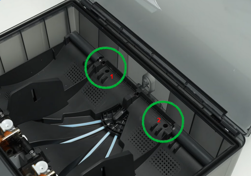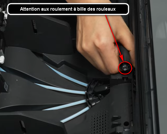 Si des débris ou des résidus de filament excessifs s'accumulent à l'intérieur du plateau de chargement des bobines, provoquant une résistance accrue lors du chargement ou du déchargement du filament, il est recommandé de démonter le plateau de chargement des bobines pour un nettoyage interne.