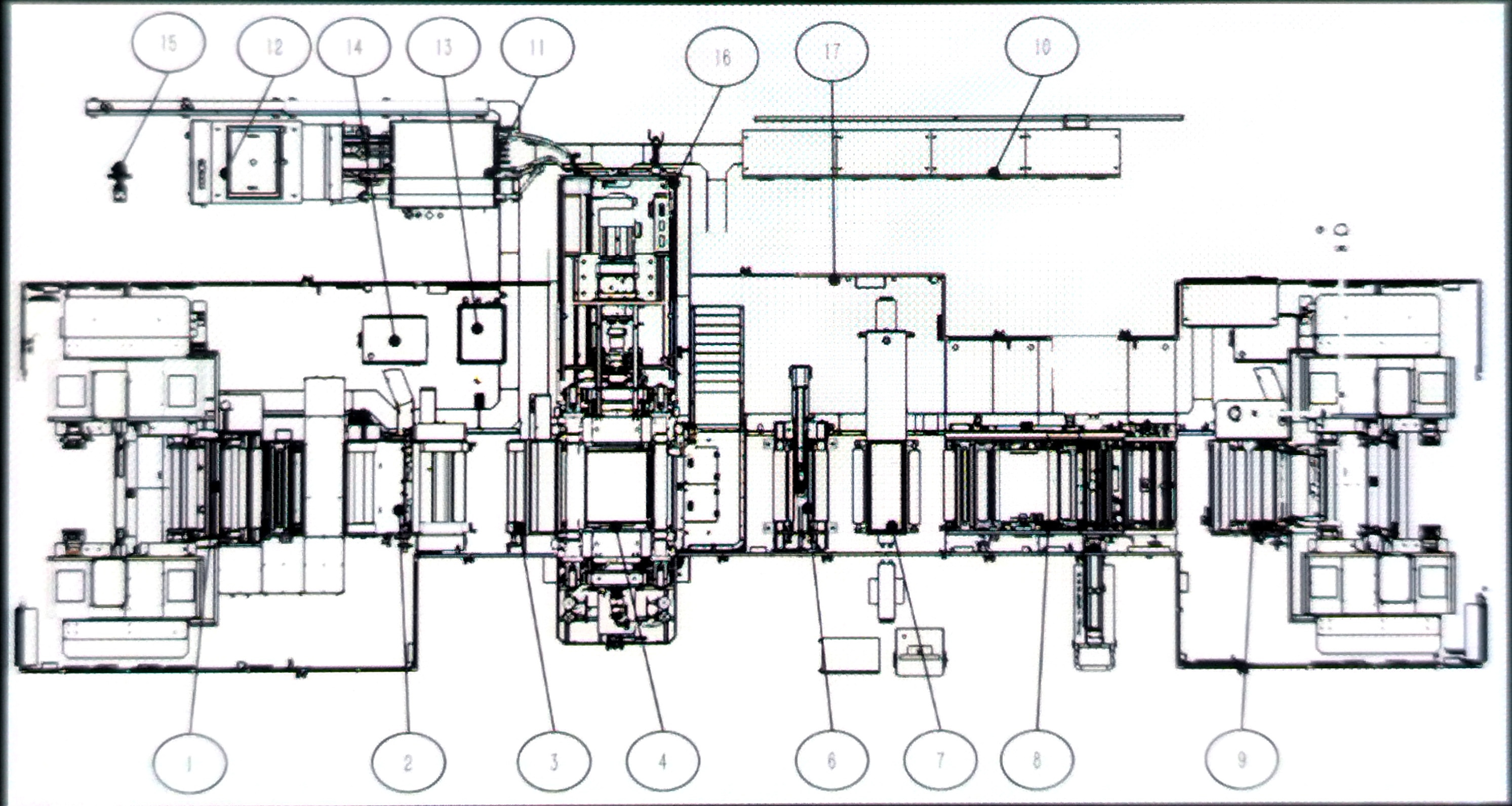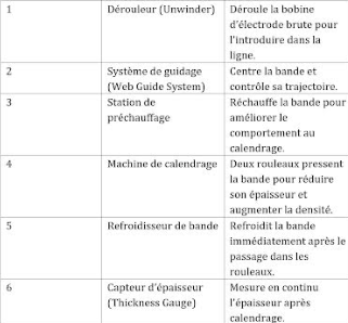1. Unité de déroulement , 2. Unité d'aplatissement avant, 3.Unité de préchauffage, 4. Module de Calandrage, 5. Unité d'aplatissement arrière, 6. Unité de refroidissement, 7. Unité de mesure d'épaisseur laser, 8. Unité de refendage 1 , 9. Unité d'enroulement, 10. Armoire de commande et conduits de câbles, 11. Système hydraulique, 12. Tuyaux de chauffage, 13. Tuyaux de refroidissement, 14. Chauffage de languettes, 15. Tuyaux de dépoussiérage, 16. Capot de l'hôte, 17. Petit environnement.