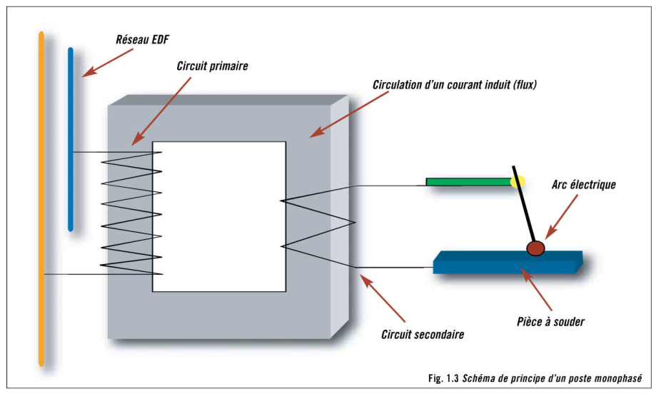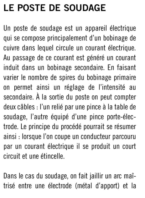 Comme un transformateur, un poste de soudage se compose d'un bobinage. Celui-ci est réglable et à puissance égale, la tension V diminue et l'intensité A augmente.